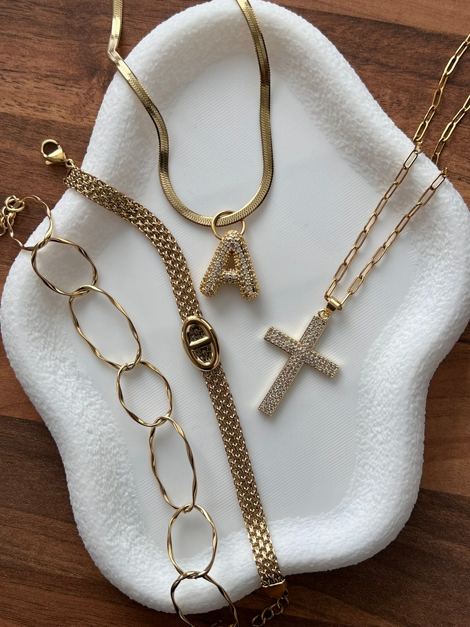 Una colección que combina diseños dorados, perlas, símbolos y detalles atemporales, donde la delicadeza y la fuerza conviven en equilibrio.